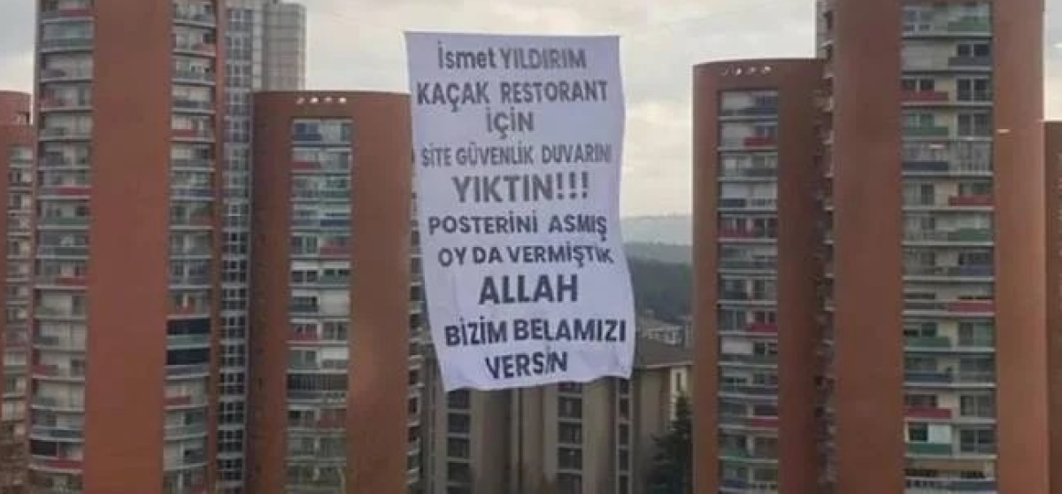 İstanbul'un Ümraniye ilçesinde bulunan Yeşil Vadi Konakları sitesinin yönetimi, Ümraniye Belediye Başkanı İsmet Yıldırım'ı siteye astıkları dev bir pankartla dikkat çeken bir şekilde protesto etti.Sitenin güvenlik duvarının kaçak bir restoran işletmesi için belediyenin emriyle yıkıldığını öne süren site yönetimi, sitedeki binaların çatıları arasına, "İsmet Yıldırım kaçak restoran için site güvenlik duvarını yıktın! Posterini asmış, oy da vermiştik. Allah bizim belamızı versin" ifadelerinin yer aldığı bir pankart astı.Kaynak:HalkTV.com.tr