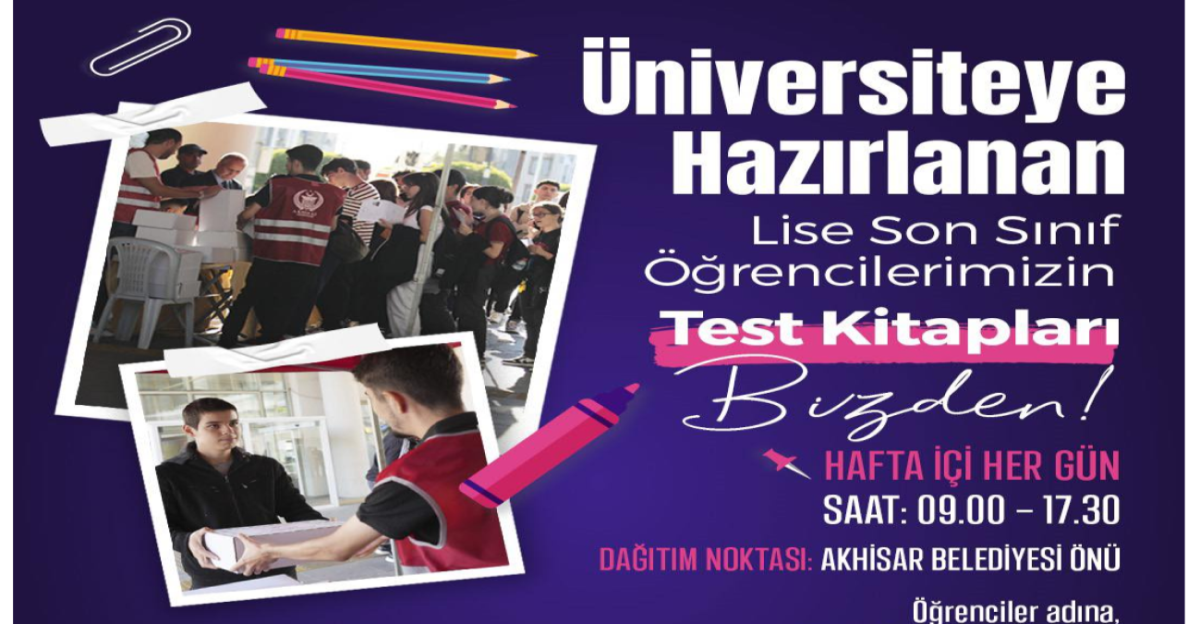 Akhisar beldiyesinden lise son sınıf öğrencilerine ücretsiz test kitabı. Belediye Üniversiteye hazırlanan lise son sınıf öğrencilerimizin yanında olmaya devam ediyor.Akhisar Belediyesi olarak, 12. sınıfta ve devlet okullarında okuyan tüm gençlerimize tüm derslerden test kitaplarını ücretsiz olarak dağıtıyoruz.Gençlerimizin başarısı için yanlarındayız.Hayallerinizi birlikte gerçekleştireceğiz!