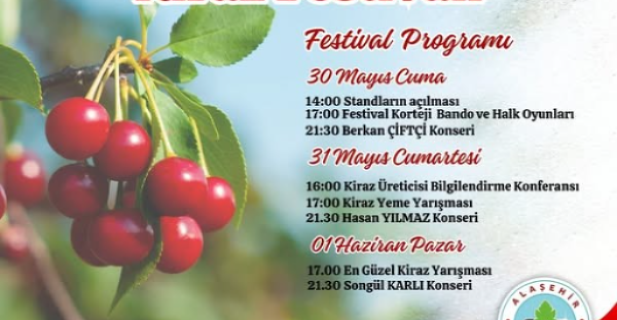 Alaşehir Uluderbent 'de 30 Mayıs - 1 Haziran arasında gerçekleştirilecek Kiraz Festivali nedeniyle bir çok etkinliğe ev sahipliği yapacak. 30 Mayıs günü korteji, bando ve halk oyunları gösterileri ile başlayacak olan festivalin ilk gününde Berkan Çiftçi en sevilen şarkılarını Alaşehirliler için seslendirecek. Festivalin ikinci günü kiraz üretici konferansı ve kiraz yeme yarışması ve ünlü sanatçı Hasan Yılmaz konseri gerçekleştirilecek. 1 Haziran festivalin son gününde ise en güzel kiraz seçilerek yetiştiricisine ödül verilecek. Final akşamında sahne alacak Songül Karlı, Alaşehirlilere unutulmaz bir müzik ziyafeti sunacak.Öte yandan Alaşehir Belediyesi üç gün zabıta müdürlüğü önünden sürekli servis araçlarıyla vatandaşları Uluderbent Mahallesine taşıyacak.