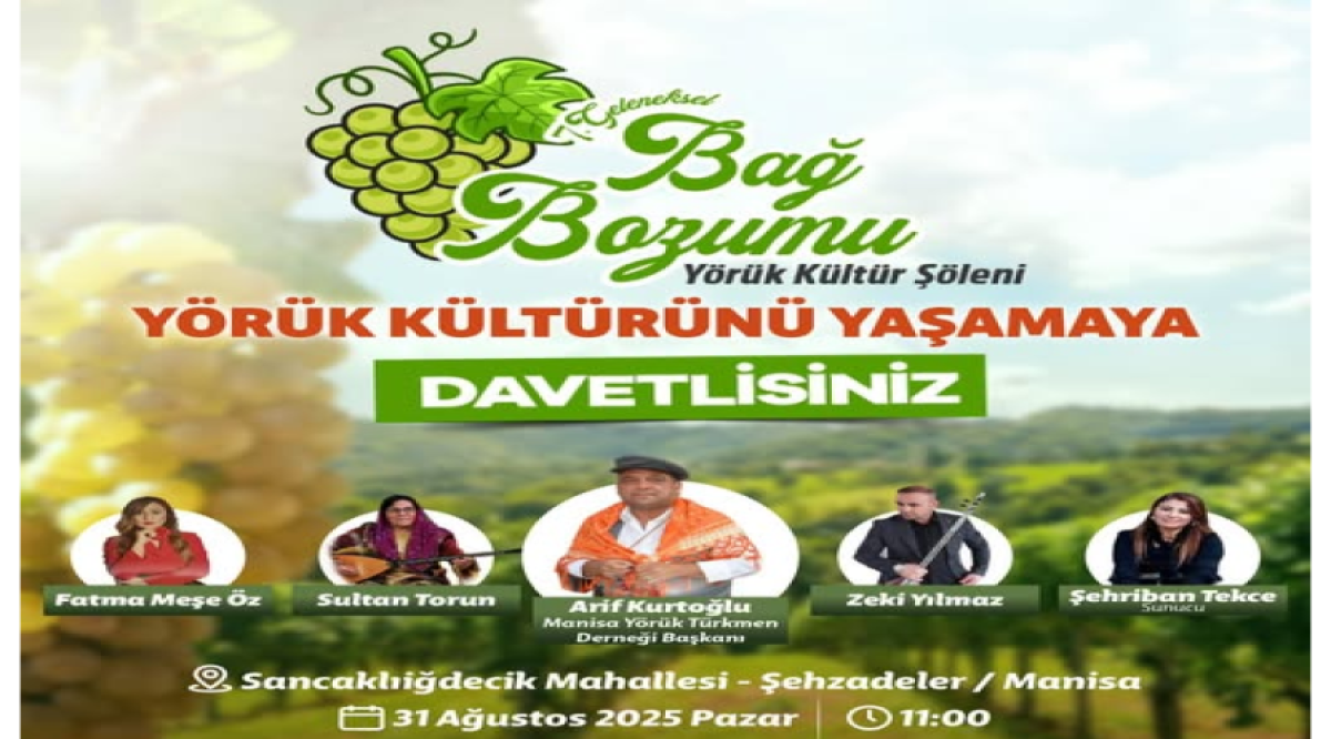 Bağ bozumu yörük kültür şöleni başlıyor Editor: Haber236 30 Ağustos 2025 - 10:06 Bu haber 123 defa okunmuştur. Paylaş Tweetle WhatsApp YORUMLAR 0 Yorum adlı kullanıcıya cevap Başkan Dönmez'den eski pazar yeri turizme kazandırma müjdesi 16 ülkeden 230 yarışmacı Manisa'da Manisa Mesir macunu festivali heyecanı başlıyor! 45. İstanbul Film Festivali'nde ödüller sahiplerini buldu Bağımlılıkla mücadele eğitimi Endonezya Türkiye büyükelçisi Achmad Rizal Purnama ve Besim Dutlulu maç izledi