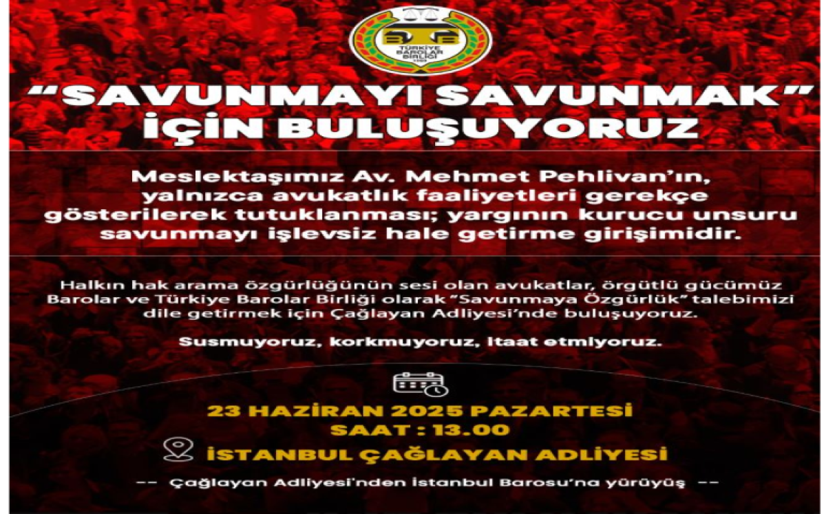 "Meslektaşımız Av. Mehmet Pehlivan’ın, yalnızca avukatlık faaliyetleri gerekçe gösterilerek tutuklanması; yargının kurucu unsuru savunmayı işlevsiz hale getirme girişimidir. Halkın hak arama özgürlüğünün sesi olan avukatlar, örgütlü gücümüz Barolar ve Türkiye Barolar Birliği olarak “Savunmaya Özgürlük” talebimizi dile getirmek için Çağlayan Adliyesi’nde buluşuyoruz. Susmuyoruz, korkmuyoruz, itaat etmiyoruz."Kaynak:Halk TV Haber Merkezi