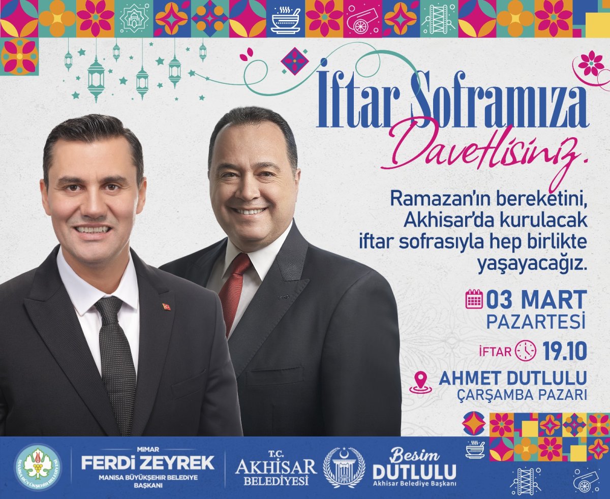 Akhisar Belediye Başkanı Besim Dutlulu ise, “Ramazan’ın bereketini, Akhisar’da kurulacak iftar sofrasıyla hep birlikte yaşayacağız. Bu akşam, Manisa Büyükşehir Belediye Başkanımız Ferdi Zeyrek’in de katılımıyla Ahmet Dutlulu Çarşamba Pazarı’nda gerçekleşecek, Manisa Büyükşehir Belediyesi Toplu İftar Organizasyonuna tüm halkımızı bekliyoruz” dedi.