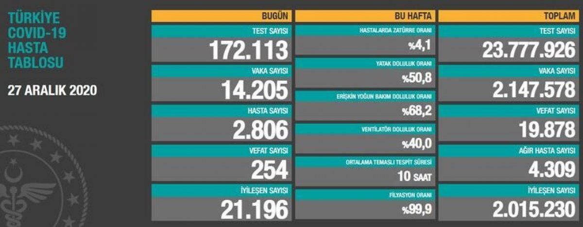Türkiye'de son 24 saatte 172 bin 113 Kovid-19 testi yapıldı, 14 bin 205 kişinin testi pozitif çıktı, 254 kişi hayatını kaybetti.Ağır hasta sayısı 4 bin 309 oldu, 21 bin 196 kişinin Kovid-19 tedavisi/karantinasının sona ermesiyle iyileşen sayısı 2 milyon 15 bin 230'a yükseldi.Sağlık Bakanı Koca, "Bugün tespit edilen 2 bin 806 hastamız var. Vaka ve hasta sayımız düşmeye devam ediyor. Temaslı sayısı ve test talebi de azalıyor." dedi.