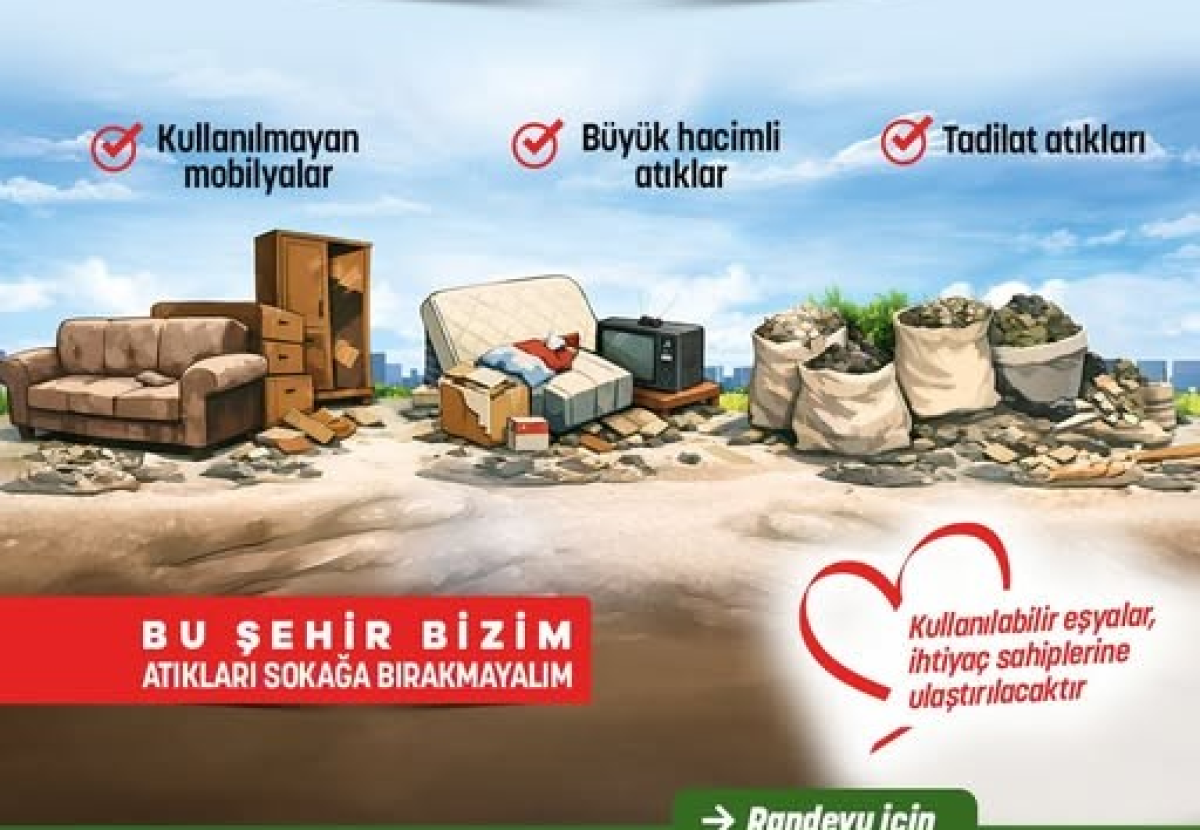 Manisa büyükşehir belediyesi Eskileriniz sokağın yükü değil, bizim görevimiz olsun. Büyük hacimli atık, mobilya ve tadilat atıklarını kapıya değil, randevuyla bize bırakın; Manisa’nın estetiğini birlikte koruyalım! Siz randevunuzu alın, biz gelip bertaraf edelim.
