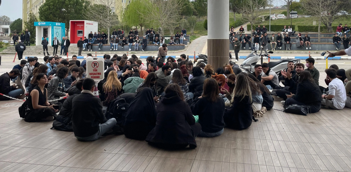 Muradiye kampüsünde oturma eyleme yapan öğrenciler, “Her yer ODTÜ, Her yer direniş” sloganları attı. Hep beraber İzmir marşını söyleyen öğrencilerin oturma eylemi devam ederken şuana kadar herhangi bir olay yaşanmadı