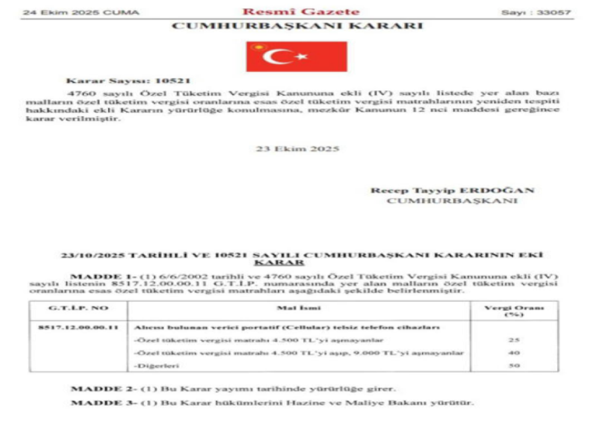 Resmi Gazetenin bugünkü sayısında yayımlanan ve ÖTV kanununa ekli IV sayılı listede düzenlemeler yapan Cumhurbaşkanı kararına göre, cep telefonlarından (alıcısı bulunan verici portatif cellular telsiz telefon cihazları) alınan ÖTVnin belirlenmesinde esas alınan vergi matrahı sınırları; yüzde 25 ÖTV uygulanan dilim için 1,500 TLden 4,500 TLye, yüzde 40 ÖTV uygulanan dilim için 1,500 TL-3,000 TLden 4,500-9,000 TLye, yükseltildi. Bu dilimlere dahil olmayan diğer cep telefonları için yüzde 50 oranında ÖTV uygulaması devam edecek.Uygulama Resmi Gazetede yayımlanmasıyla birlikte bugün başladı.