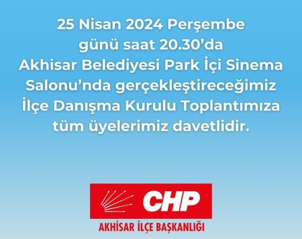CHP Akhisar İlçe Başkanlığı, tüm üyelerini İlçe Danışma Kurulu Toplantısına çağırdı. Partililerin katılımıyla yapılaca toplantıda ilçenin geleceğini şekillendirecek konuların masaya yatırılması ve üyelerle fikir alışverişinde bulunacağı öğrenildi.Partinin yerel ve genel politikalarının ele alınacağı bu önemli buluşmada, ilçenin sosyal, ekonomik ve siyasal gelişimine katkıda bulunacak stratejilerin belirlenmesi hedefleniyor. CHP Akhisar İlçe Başkanlığı, tüm üyelerini demokratik süreçlere katılım sağlamak ve seslerini duyurmak için bu toplantıya katılmaya davet ediyor.