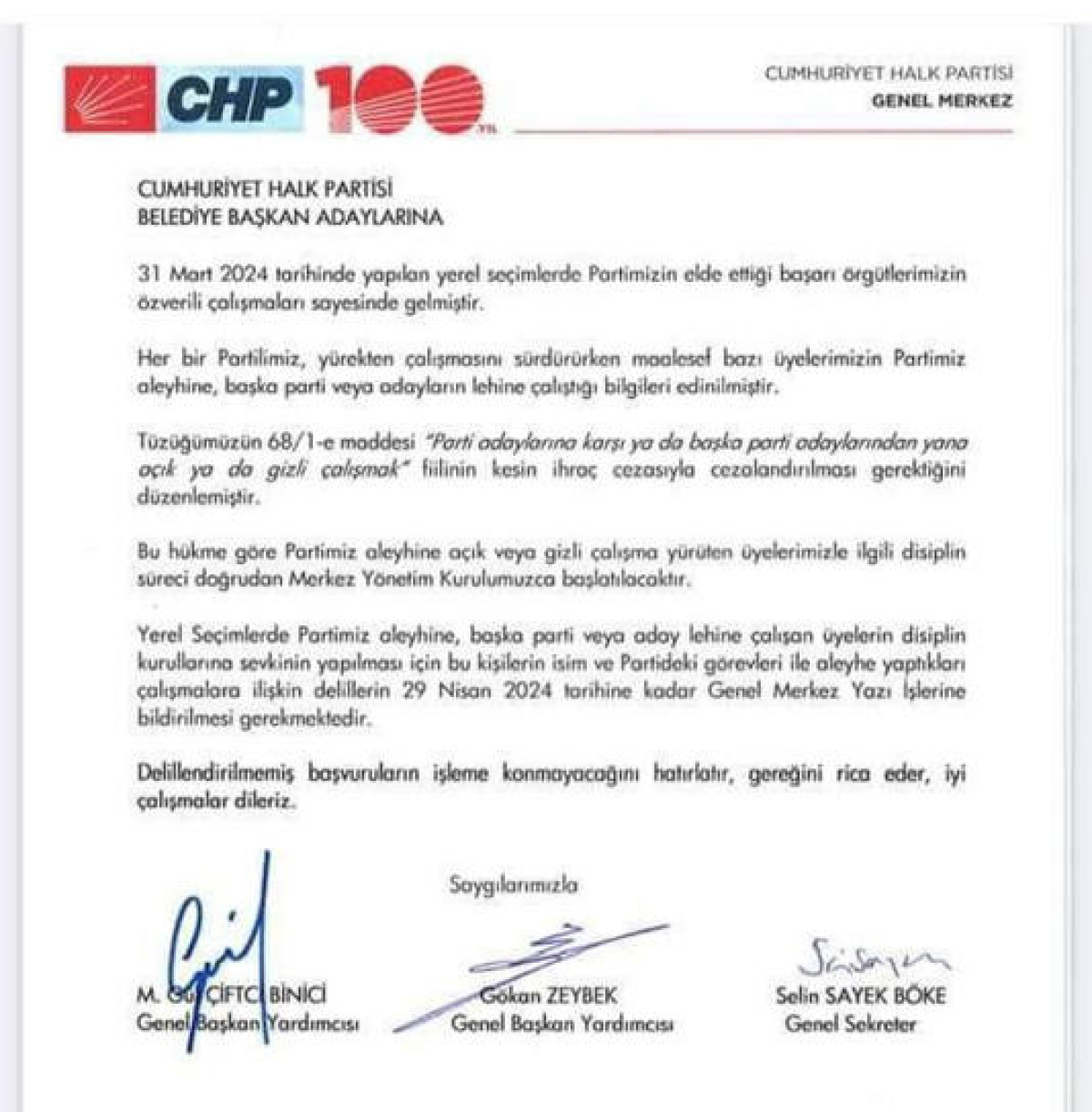 ''31 Mart 2024 tarihinde yapılan yerel seçimlerde partimizin elde ettiği başarı örgütlerimizin özverili çalışmaları sayesinde gelmiştir. Her bir partilimiz, yürekten çalışmasını sürdürürken maalesef bazı üyelerimizin partimiz aleyhine, başka parti veya adayların lehine çalıştığı bilgileri edinilmiştir. Tüzüğümüzdeki 68/1-e maddesi "Parti adaylarına karşı ya da başka parti adaylarından yana açık ya da gizli çalışmak" fiilinin kesin ihraç cezasıyla cezalandırılması gerektiğini düzenlemiştir. Bu hükme göre partimiz aleyhine açık veya gizli çalışma yürüten üyelerimizle ilgili disiplin süreci doğrudan Merkez Yönetim Kurulumuzca başlatılacaktır.Yerel seçimlerde partimiz aleyhine, başka parti veya aday lehine çalışan üyelerin disiplin kurullarına sevkinin yapılması için bu kişilerin isim ve partideki görevleri ile aleyhe yaptıkları çalışmalara ilişkin delillerin 29 Nisan 2024 tarihine kadar genel merkez yazı işlerine bildirilmesi gerekmektedir.Delillendirilmemiş başvuruların işleme konmayacağını hatırlatılır, gereğini rica eder, iyi çalışmalar dileriz.''Kaynak:Habertürk.com.tr