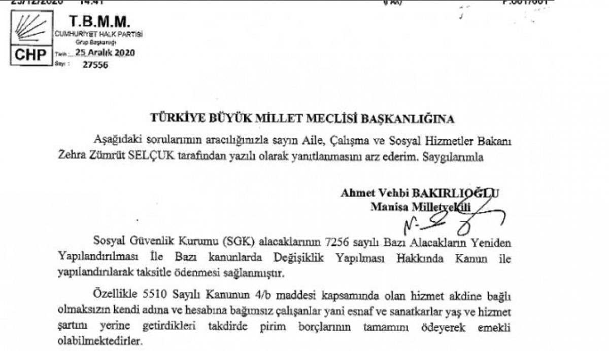 Önergesinde, daha önceki borç yapılandırma yasalarında Bakanlık ile kamu bankaları arasında imzalanan protokol ile emeklilik hakkı kazanan çiftçiler, esnaf ve sanatkarlar kredi çekerek SGK’ya olan borçlarını kapattıklarını ve emekli olabildiklerini hatırlatan Bakırlıoğlu  son çıkarılan 7256 Sayılı yasa için böyle bir protokolün imzalanmadığını ve bu nedenle 4/b kapsamındaki esnaf ve çiftçilerin borcunu yapılandırsa bile borcun tamamını kapatamadıkları için emekli olamadıklarını, bu konuda çok sayıda şikayet geldiğini ve esnaf odalarının, önceki yapılandırma yasalarında olduğu gibi bankalar ile protokol yapılarak esnaf ve sanatkarların emekli olmalarına olanak sağlanmasını istediklerini ifade etti.Emeklilik için yaş ve prim şartını tamamlayan ancak kuruma borcu olan 4/b kapsamındaki çiftçilerin, esnaf ve sanatkarların kredi çekerek borçlarını kapatmaları ve emekli olabilmeleri için bankalarla protokol yapılması düşünülüyor mu diye soran CHP Manisa Milletvekili Ahmet Vehbi Bakırlıoğlu başvuru süresinin dolmasına az bir zaman kaldığını bu nedenle sürenin uzatılarak emekli olacakların bankalardan kredi çekerek borçlarını kapatmalarına ve emekli olmalarına olanak sağlanması gerektiğini sözlerine ekledi.