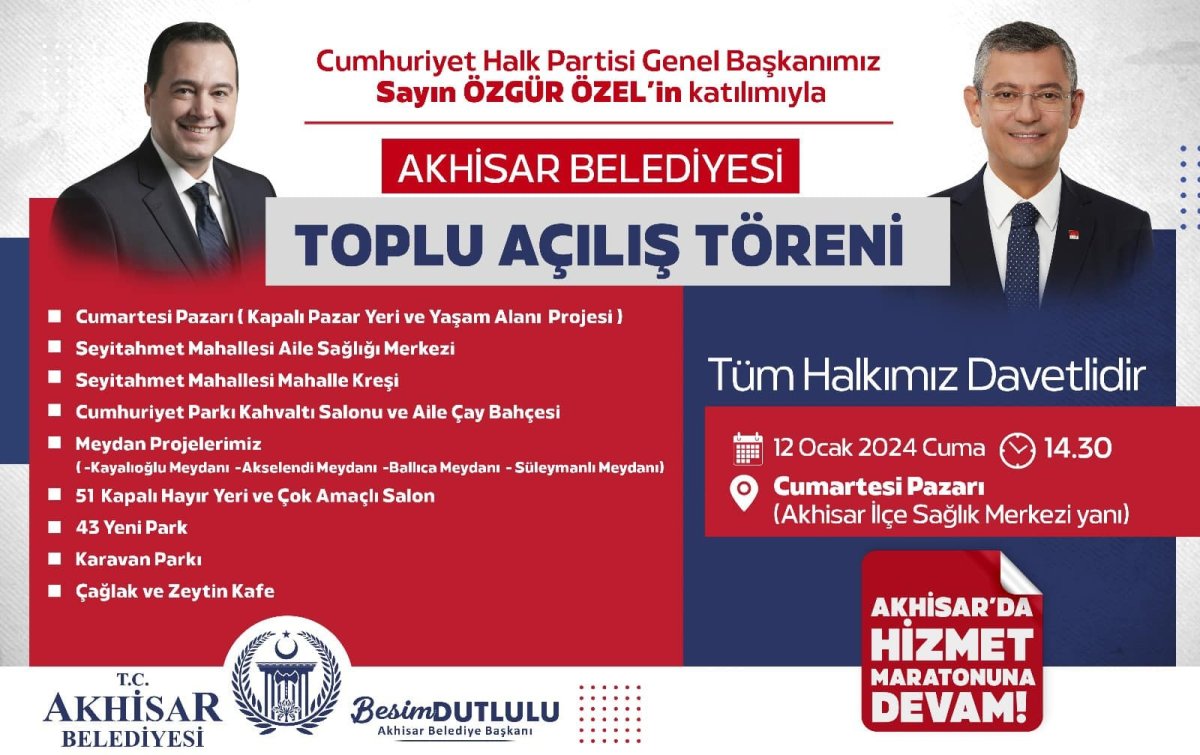 Akhisar Belediyesi tarafından yapımı tamamlanan Ulucami Mahallesi Cumartesi Pazarı ve çeşitli yatırım hizmetleri, 12 Ocak Cuma günü Cumartesi Pazarı'nda Cumhuriyet Halk Partisi Genel Başkanı Özgür Özel’in de katılımıyla gerçekleştirilecek toplu açılış töreniyle tanıtılacak.Akhisar Belediyesi tarafından yapımı tamamlanan Ulucami Mahallesi Cumartesi Pazarı başta olmak üzere Seyitahmet Mahallesi Aile Sağlığı Merkezi, Seyitahmet Mahallesi Mahalle Kreşi, Cumhuriyet Parkı Kahvaltı Salonu ve Aile Çay Bahçesi gibi yatırımlar ile birlikte, yapımı tamamlanan 4 meydan projesi, 51 kapalı hayır yeri ve çok amaçlı salon, 43 yeni park, karavan parkı ile Çağlak ve Zeytin Kafe için toplu açılış töreni gerçekleştirilecek.12 Ocak Cuma günü saat 14.30’da Akhisar Cumartesi Pazarında yapılacak olan toplu açılış töreni, Cumhuriyet Halk Partisi Genel Başkanı Özgür Özel’in de katılımıyla gerçekleştirilecek.Akhisar Belediye Başkanı Besim Dutlulu ise yaptığı açıklamada tüm Akhisarlıları Akhisar Belediyesi’nin yaptığı bu büyük hizmetlerin toplu açılışı törenine davet etti.Başkan Dutlulu ; "Akhisar’da hizmet maratonu devam ediyor. Cumhuriyet Halk Partisi Genel Başkanımız Sayın Özgür Özel’in katılımıyla gerçekleştireceğimiz toplu açılış törenimize tüm halkımızı bekliyoruz. Akhisar’ımıza kazandırdığımız bu güzel eser ve hizmetlerin açılışını halkımız ile birlikte coşkuyla yapacağız” dedi.