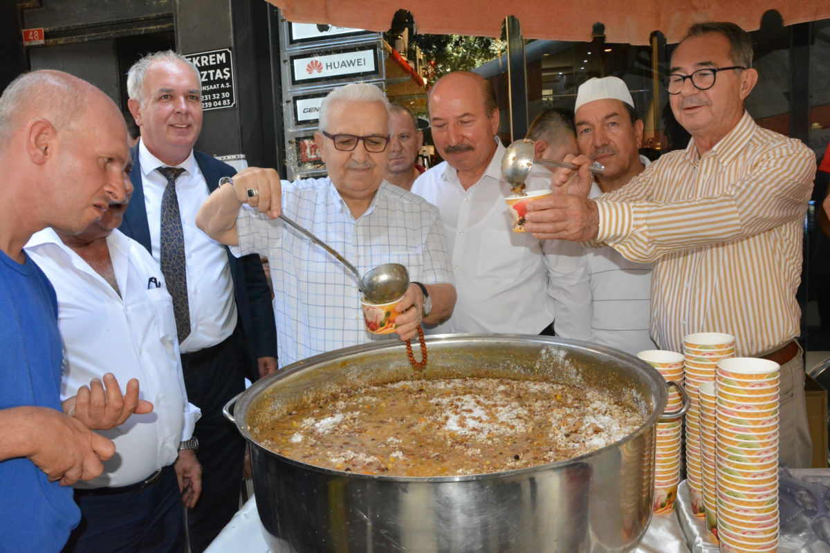 Hatuniye Cami İmam Hatibi Hayrettin Çoban tarafından okunan duanın ardından Başkan Çınar, Başkan Geriter ve Manisa Esnaf Sanatkarlar Odası Başkanı Bahattin Akyüz vatandaşlara aşure dağıttı.