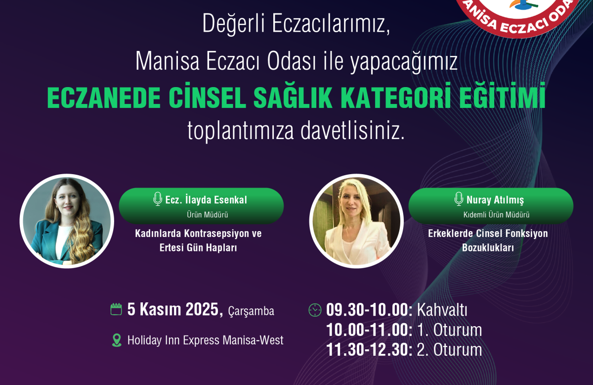Manisa Eczacı Odası Eğitim Komisyonu tarafından, Abdi İbrahim katkılarıyla düzenlenen “Eczanede Cinsel Sağlık Kategorisi” başlıklı eğitimimize tüm meslektaşlarımızı bekliyoruz.Ecz. İlayda Esenkal ve Ürün Müdürü Nuray Atılmış’ın sunumlarıyla gerçekleşecek olan eğitimimizde, eczanede cinsel sağlık danışmanlığı ve ürün kategorisi yönetimi üzerine değerli bilgiler paylaşılacaktır.