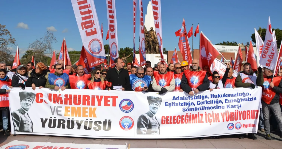 ''Özelleştirme politikaları ile iş güvencesi ortadan kaldırıldı, taşeron sistemi yaygınlaştırıldı, sendikalar etkisizleştirildi. İşçiler, karanlık maden ocaklarında, inşaat alanlarında, fabrikalarda ölümle burun buruna çalışmak zorunda bırakıldı. Soma ve Ermenek katliamları bunun en acı göstergesidir! Ancak biz buradayız! Bugün Manisa’da, Soma’da, Türkiye’nin dört bir yanında emeğimize sahip çıkmak için dimdik ayaktayız! Emek mücadelesi yalnızca ekmek mücadelesi değildir! Aynı zamanda onur mücadelesidir, özgürlük mücadelesidir, laiklik ve Cumhuriyet mücadelesidir! Çünkü biliyoruz ki iş cinayetlerine, özelleştirmelere, yağma düzenine karşı sınıf bilincini yükseltmeden, bir araya gelmeden, emeği yüceltmeden, emperyalist düzene ve faşizme karşı durulamaz! Cumhuriyet’in kazanımları emeğin, özgürlüğün ve eşitliğin teminatıdır. Bugün Cumhuriyet’i yok etmeye çalışanlara karşı en büyük direnişi emekçiler sergileyecektir! Bugün bu bilinçle hareket eden işçiler var! Hak gasplarına karşı direnişler sürüyor, direnişlere yenileri ekleniyor! Fernas, Akcanlar, Çayırhan işçileri bugün sermayeye, sömürüye karşı omuz omuza mücadele ediyor! Bizler de onların yanındayız, dayanışmamızı büyütüyoruz! Türkiye’de insan hayatının bir değerinin olmadığını her felakette bir kez daha görüyoruz! 6 Şubat depremlerinde on binlerce yurttaşımızı kaybettik. Rant uğruna, denetimsiz ve çürük binalarla halkın yaşamı hiçe sayıldı. Bolu Kartalkaya’da yaşanan facia, insan hayatının ne kadar değersiz olduğunu bir kez daha gösterdi. Önlenebilir bir felaketin sorumluları hesap vermemekte, her zamanki gibi suçu halkın üzerine yıkmaktadırlar. Buradan soruyoruz: Kaç çocuğumuz, yurttaşımız yitip gidecek? Kaç kişi daha kar uğruna, o kardan dağıtılan komisyonlar, rüşvetler uğruna göz göre göre feda edilecek? Eğitim-İş olarak; AK Parti’nin yağma ve talan düzenine karşı, Açlık sınırının altında yaşamaya mahkum eden sefalet ücretine karşı, İşçi kıyımlarına, güvencesizleştirme politikalarına, taşeron düzenine karşı, İş cinayetlerine, sendikasızlaştırma çabalarına ve örgütlenme özgürlüğünü gasp eden politikalara karşı, İktidarın gerici eğitim modeline, dindar ve kindar nesil yetiştirme politikasına karşı, Kamusal, bilimsel, laik ve Cumhuriyet değerlerine bağlı eğitim için mücadelemizi sürdürüyoruz, sürdüreceğiz''