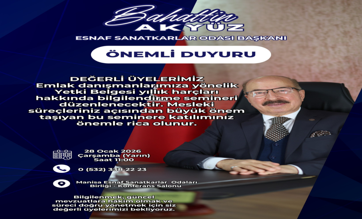 Yetki Belgesi yıllık harçları hakkında bilgilendirme amacıyla düzenlenecek seminere tüm emlak danışmanlarımız davetlidir.
