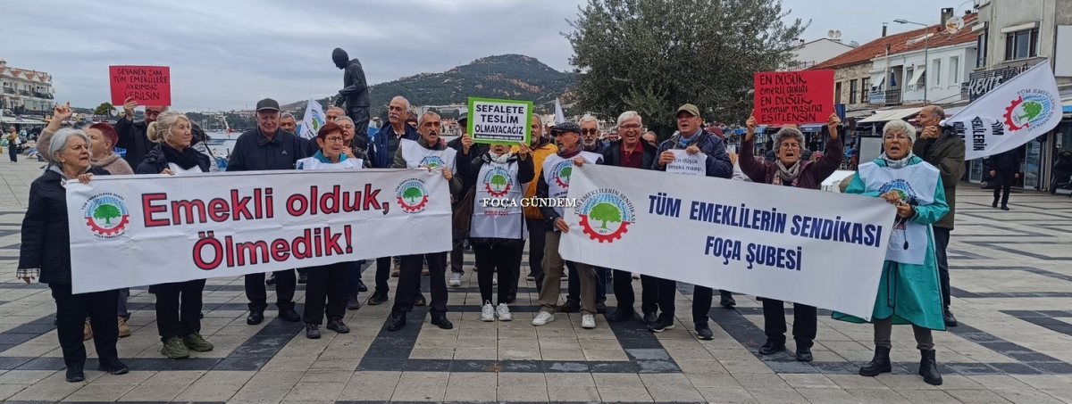 Tüm Emeklilerin Sendikası üyesi emekliler İzmir’in Foça İlçesi’nde düzenlenen eylem ve basın açıklamasıyla TÜİK’in açıkladığı Kasım Ayı enflasyon rakamlarını ve Ocak ayında düşünülen zam oranlarını protesto ettiler. Ekonomi Bakanı Mehmet Şimşek’in programının emekliyi yok saydığını savunan emekliler “sadaka değil, hak ettiğimiz refahı istiyoruz” sloganları attılar.
