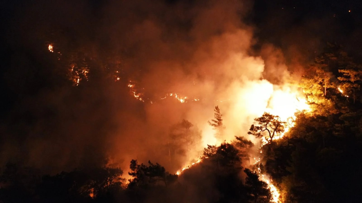 Ege Bölgesi'nin kıyılarında yer alan Gökova Körfezi, Turnalı bölgesinde başlayan yangının söndürme çalışmaları devam ediyor.Makilik ve ormanlık alanda çıkan ve geniş bir alana yayılmış durumda.Kıran köyünün körfeze bakan sırtlarında zaman zaman parlayan alevlere gece karadan müdahale eden ekiplerin mücadelesi drone kamerasıyla görüntülendi.Menteşe Belediye Başkanı Gonca Köksal da bölgede başlayan ve Kıran Mahallesi istikametine ilerleyen yangın söndürme çalışmalarını yerinde incelemişti.