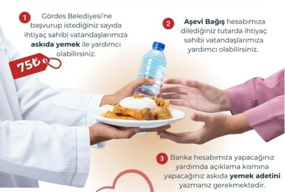 Siz de sadece 75 TL ile bir kişinin sıcak bir öğün yemesine vesile olabilir, dayanışmanın en güzel örneğini yaşatabilirsiniz.Bağış yaparken açıklama kısmına “Yemek Adetini” yazmanız gerekmektedir.Göndereceğiniz tutar, belirttiğiniz kişi sayısına göre sistemimizde işlenecektir.Gördes Belediyesi Aşevi Hesabı: