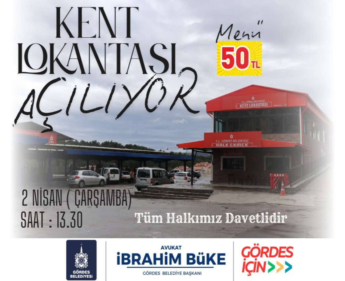 Gördes Belediyesi olarak, Kent Lokantası yarın, 2 Nisan Çarşamba günü saat 13.30’da hizmete girmektedir. 50 TL’lik menümüzle tüm halkımıza kaliteli ve uygun fiyatlı yemekler sunmaya başlıyoruz. Tüm halkımızı bekliyoruz!