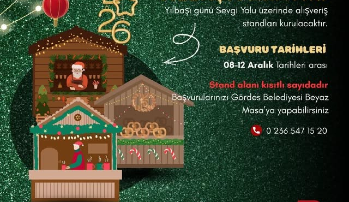 Gördes’te Yılbaşı Panayırı Başlıyor! Yeni yıla yaklaşırken ilçemizde hem renkli hem de hareketli bir yılbaşı atmosferi oluşturmak için Sevgi Yolu üzerinde yılbaşı panayırı kurulacaktır. El emeği ürünler, hediyelik eşyalar ve yılbaşı ruhunu yansıtan pek çok stand ile hemşehrilerimiz keyifli bir alışveriş deneyimi yaşayacak.