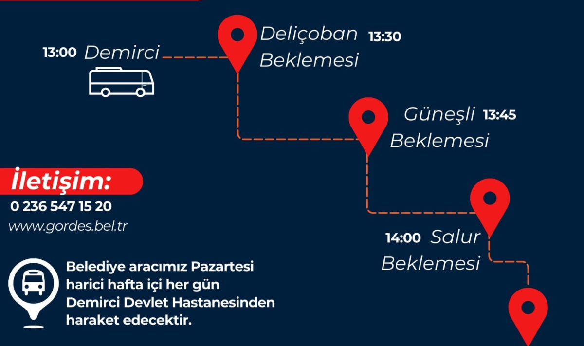Gördes'ten Demirci'ye Kolay Ulaşım Başlıyor.Gördes Belediyesi, halkımızın sağlığını düşünerek yeni bir ulaşım hizmetini hayata geçiriyor! Artık Salı, Çarşamba, Perşembe ve Cuma günleri 15 Temmuz Parkı önünden Demirci Devlet Hastanesi'ne direk otobüs seferleri düzenlenecek.