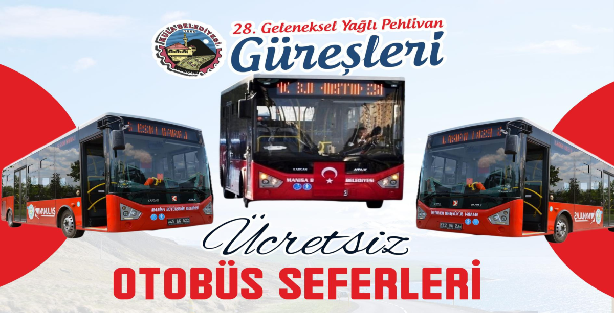 Köylere ulaşım ücretsiz yapılacak.28. Geleneksel Kula Yağlı Pehlivan güreşlerine köylerde yaşayan vatandaşlarımızın ulaşımını sağlamak amacıyla 14. Eylül 2025 Pazar sabah saat 08.00'da ücretsiz otobüs seferi düzenlenecektir. Otobüsler, güreş alanına gelen vatandaşlarımızı akşam final güreşi tamamlandıktan sonra tekrar köylere bırakacaktır. Ulaşım ücretsizdir.