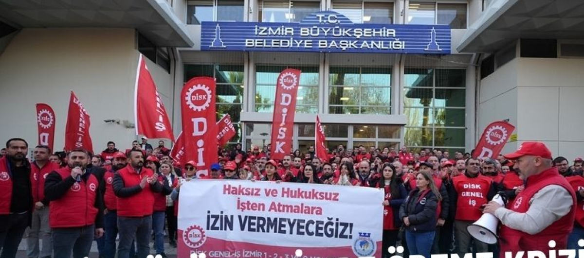 İzmir Büyükşehir Belediyesi’nde işçi eylemlerine bir yenisi daha ekleniyor. Belediyeye bağlı İZENERJİ, İZELMAN ve İZFAŞ şirketlerinde çalışan ve DİSK/Genel-İş Sendikası’nın 1, 2, 3 ve 9 No’lu şubelerinde örgütlü işçiler, üç aydır ödenmeyen sosyal haklarını protesto etmek için alana iniyor. Göreve geldiği günden bu yana işçi ve memur kesimiyle sık sık gerilim yaşayan İzmir Büyükşehir Belediye Başkanı Cemil Tugay’a bir çağrı daha yapılacak.DİSK/Genel-İş Sendikası’nın 1, 2, 3 ve 9 No’lu şubelerinde örgütlü işçiler, üç aydır ödenmeyen sosyal hakları nedeniyle eylem kararı aldı. Kültürpark 1 No’lu Hol önünde basın açıklaması yapacak olan işçiler, ardından oturma eylemi gerçekleştirecek. Yarın (Salı) günü saat 09.00’da Fuar 1 No’lu Hol önünde basın açıklaması yapılacak; işçiler, saat 10.30’da Basmane Fuar Kapısı’nda başlayacak oturma eylemini mesai bitimine kadar sürdürecek.