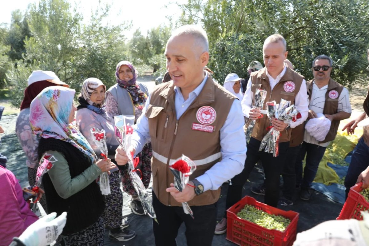 Akhisar İlçesi Zeytinliova Mahallesinde zeytin hasadı yapan çiftçi kadınları ziyaret eden Manisa İl Tarım ve Orman Müdürü Metin Öztürk, üretici kadınlara çiçek takdim etti.