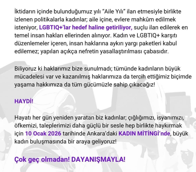 Kadınlar 10 Ocak'ta alanlara çıkıyor Editor: Haber236 06 Ocak 2026 - 09:53 - Güncelleme: 06 Ocak 2026 - 10:01 Bu haber 116 defa okunmuştur. Paylaş Tweetle WhatsApp YORUMLAR 0 Yorum adlı kullanıcıya cevap Gençler sorunlarını tartıştı CHP'den okul saldırısını incelemek için heyet görevlendirildi CHP'li il başkanlarından ortak açıklama: Teslim olmayacağız! Yunusemre'de kadına yönelik şiddetle mücadele toplantısı Türkiye'nin en ucuz çay ve kahvenin satılacağı emekli kafe açılıyor Selahattin Demirtaş'a 'Cumhurbaşkanına hakaret' suçundan hapis cezası