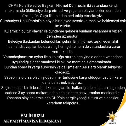 AKP manisa il başkanı Salih Hızlı, Kula belediyesinde yaşanan olayların yakın takipcisi olduklarını açıkladı.'Yaşanan olaylar bizleri derinden bulunan AKP manisa İl Başkanı Salih Hızlı,CHP'nin böyle bir olayda sesiz kalması ve beklemesinin çok üzücü olduğunu söyledi.Partinin sosyal medya hesabı Fecebook'da yer alan başkan Hızlı imzalı açıklama şöyle: