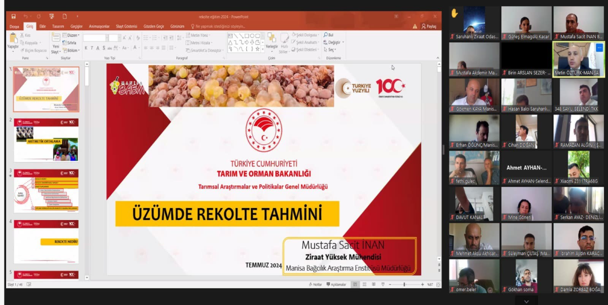 Manisa'da her yıl yapılan üzümde rekolte tahmini çalışmaları bağcılıkta sürdürülebilirlik ve ekonomik istikrar önemli bir araç konumundadır. 2024 Yılı üretim sezonunda İlimiz genelinde yürütülecek olan rekolte tahmini çalışmaları kapsamında Manisa Bağcılık Araştırma Enstitüsü Müdürlüğünde görevli Ziraat Yüksek Mühendisi Mustafa Sacit İnan tarafından İlçe Müdürlüklerimizde görevli teknik personeller ile paydaş kurumlardan rekolte tahmin komisyonu çalışmalarında yer alan üyelere yönelik olarak “Bağda Rekolte Tahmini" eğitimi gerçekleştirildi.