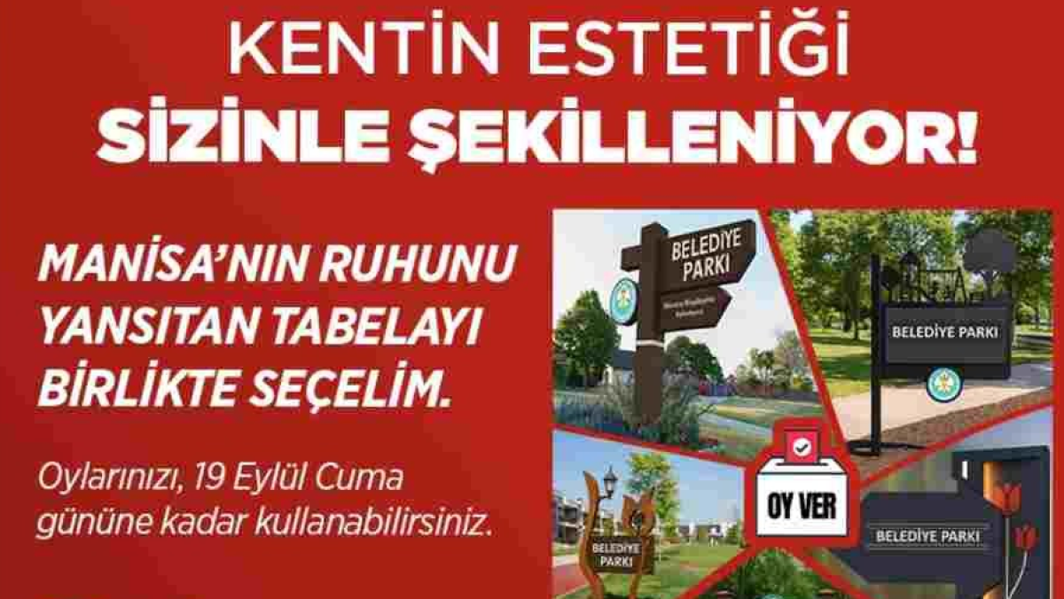 Zamanla yıpranan park tabelalarını estetik ve dayanıklı yeni tasarımlarla yenileyerek bu alanlara daha modern bir kimlik kazandırmayı hedefleyen Manisa Büyükşehir Belediyesi, kullanılacak modelleri vatandaşların belirlemesi için anket çalışması başlattı. Anket için vatandaşlar Manisa Büyükşehir Belediyesi resmi internet sitesine giriş yaparak oylarını kullanabilecek.Katılımcı yönetim anlayışı ile vatandaşların düşüncelerini, görüşlerini alan Manisa Büyükşehir Belediyesi, yeni bir anket çalışması ile vatandaşların fikirlerini almaya başladı. Kentte estetik bir görsellik oluşturmak isteyen ve bunu vatandaşların tercihi ile belirlemek isteyen Manisa Büyükşehir Belediyesi kentin çeşitli alanlarında kullanılmak üzere hazırlanan 5 farklı tabela görselini halkın beğenisine sundu.Vatandaşlar, 19 Eylül Cuma gününe kadar oy kullanarak şehirde görmek istedikleri tabela modeli fikir belirtebilecek. Ankete, Manisa Büyükşehir Belediyesi’nin resmi internet sitesinden ulaşabilecek. Bununla birlikte belirtilen linke tıklayarak ankete doğrudan ulaşabilir ve oy kullanılabilir.