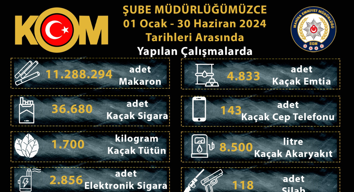 Manisa İl Emniyet Müdürlüğü Kaçakçılık ve Organize Suçlarla Mücadele Şube Müdürlüğü, 1 Ocak - 30 Haziran 2024 tarihleri arasında yürüttüğü operasyonlarla önemli başarılara imza attı.