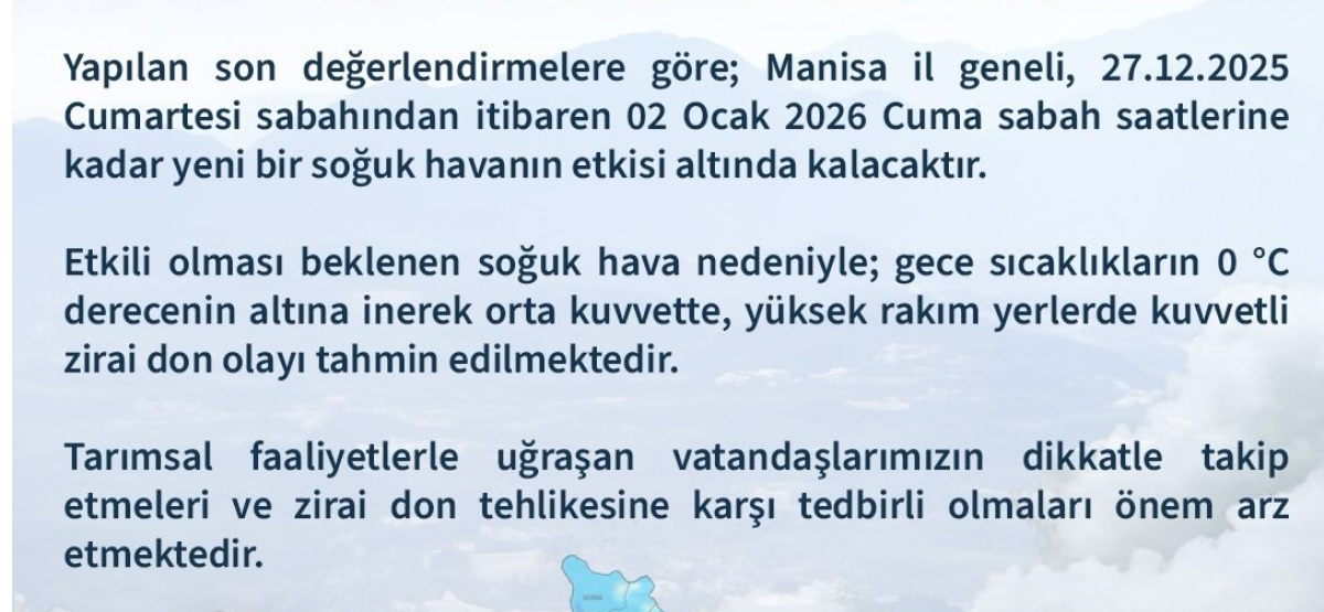 Manisa valiliğinden don uyarısı Editor: Haber236 27 Aralık 2025 - 08:01 - Güncelleme: 27 Aralık 2025 - 08:05 Bu haber 116 defa okunmuştur. Paylaş Tweetle WhatsApp YORUMLAR 0 Yorum adlı kullanıcıya cevap Gediz ve Nif çayı temizliği başladı Toplantıda OSB'nin faaliyetleri ele alındı Ataşehir belediye başkanı Onursal Adıgüzel gözaltına alındı Başkan Dutlulu halk konserlerinin ertelendiğini açıkladı Zabıta ekipleri kent huzuru için 7/24 saat işbaşında Sürücü bakıcı ve nakliyeciler eğitim toplantısı