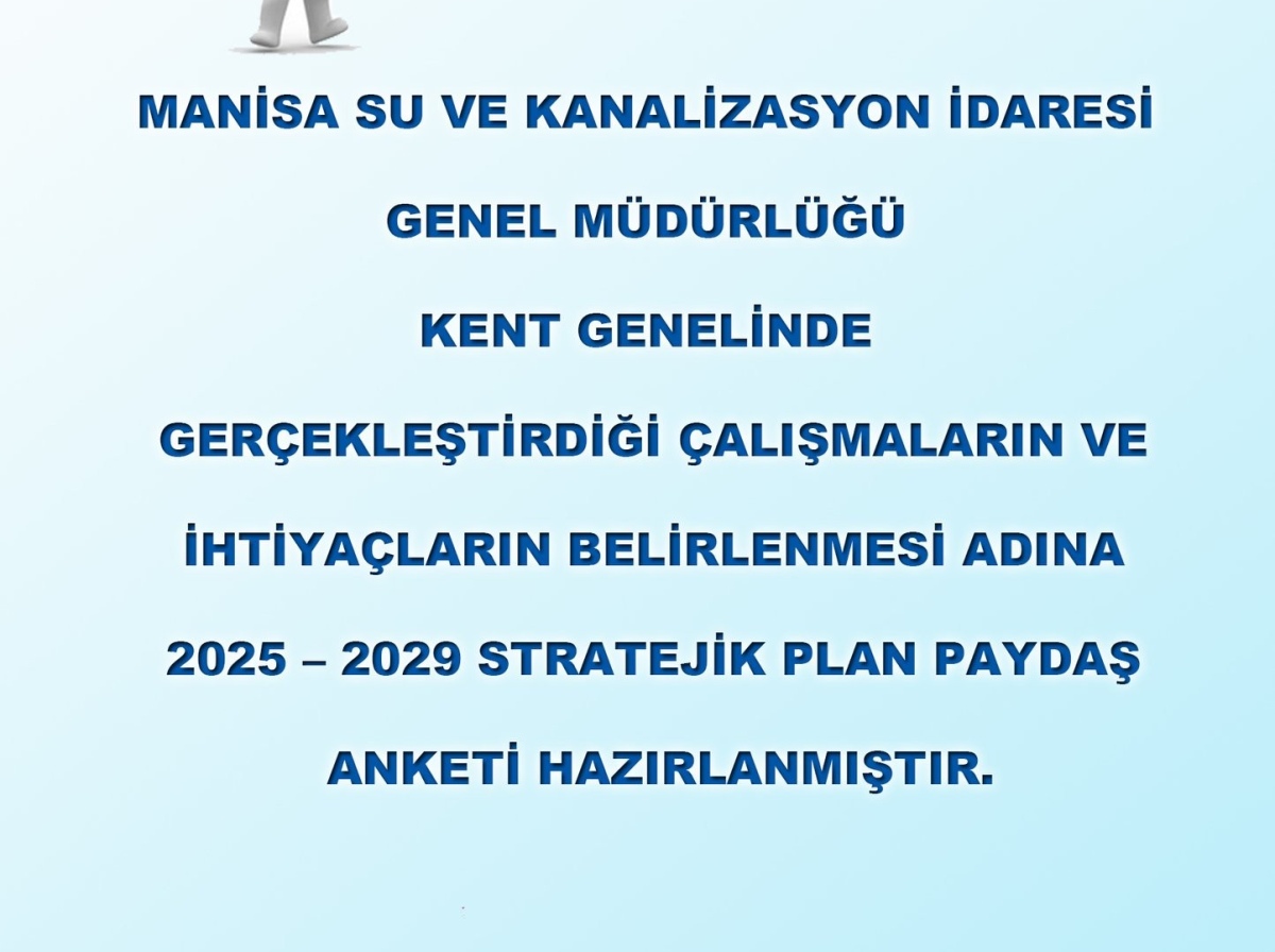Manisa Su ve Kanalizasyon İdaresi Genel Müdürlüğü (MASKİ) olarak önümüzdeki beş yıl da Manisa için yapacaklarımızı ortaya koyacağımız, kentimizi gelecekte görmek istediğimiz noktayı tanımlayacağımız 2025 – 2029 Stratejik Plan çalışmalarımızı başlattık. İlimizde bulunan kamu kurum ve kuruluşları ile sivil toplum örgütü ve meslek odaları olarak sizlerin görüşlerini almak ve yaptığımız çalışmalara değer katmak amacıyla, hazırlamış olduğumuz anketimizi sizlerle paylaşıyoruz. Anketimizde yer alan sorulara vereceğiniz yanıtlar çalışmamıza yön verecek ve bizlerin gelişimine katkı sağlayacaktır. Bu nedenle kentimiz ve bizler için değerli vaktinizden zaman ayırarak anketimize katılımınızı talep ediyoruz.İlginiz ve katılımınız için şimdiden teşekkür ederiz.