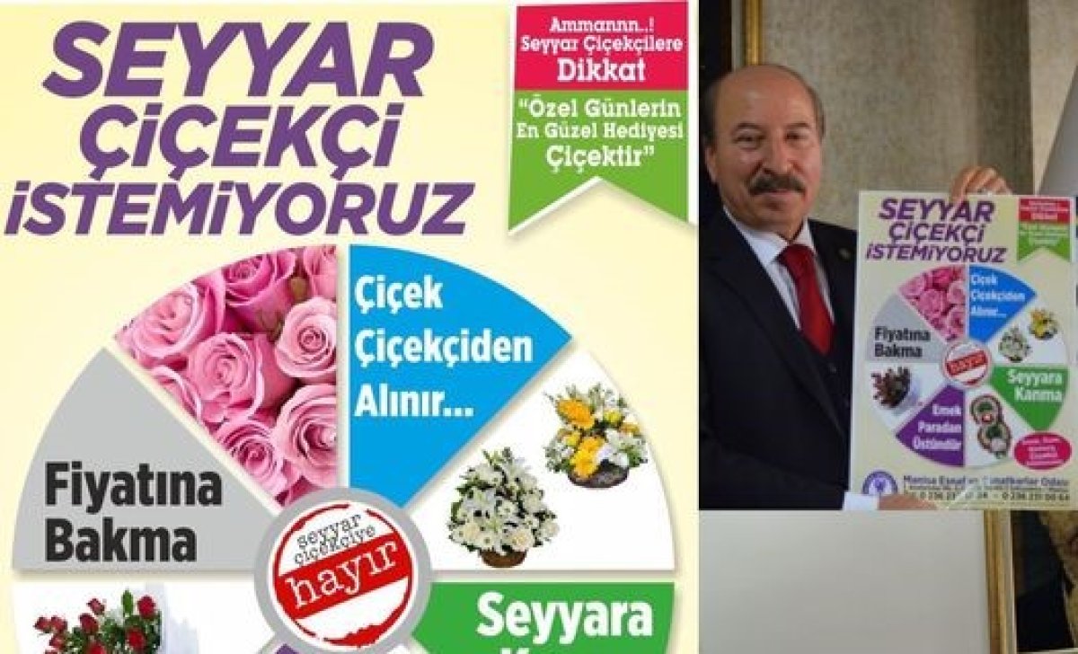 Manisa Esnaf ve Sanatkarlar Odası (MESO) Başkanı Bahattin Akyüz, yaklaşan Anneler Günü öncesinde vatandaşları korsan çiçekçilere karşı uyarmak için, “Seyyar Çiçekçi İstemiyoruz-Korsan Çiçekçiye Hayır” yazılı afişle dikkat çekti. Başkan Bahattin Akyüz, “Özel günlere kadar piyasada olmayan sadece özel günlerde ortaya çıkan ve günü kurtarmak adına çarşı, pazar ve sokaklarda kayıt dışı çalışarak haksız kazanç sağlayan fırsatçıların çiçekçi esnaflarımızın işlerine ket vurması çileden çıkartıyor. Çiçekçi esnaflarımızın özel günleri umutla beklediğini, yapılan alış verişlerle bir nebze olsun rahatladığı günler olduğunu belirtti. Piyasada haksız kazanç sağlamaya çalışanlara ‘seyyar ve korsan çiçekçilere’ fırsat vermeyeceğiz. Çiçekçi esnaflarımızın emeklerini ve haklarını kayıt dışı çalışanlara asla yedirmeyiz” dedi. CÜNEYT HASÇELİK