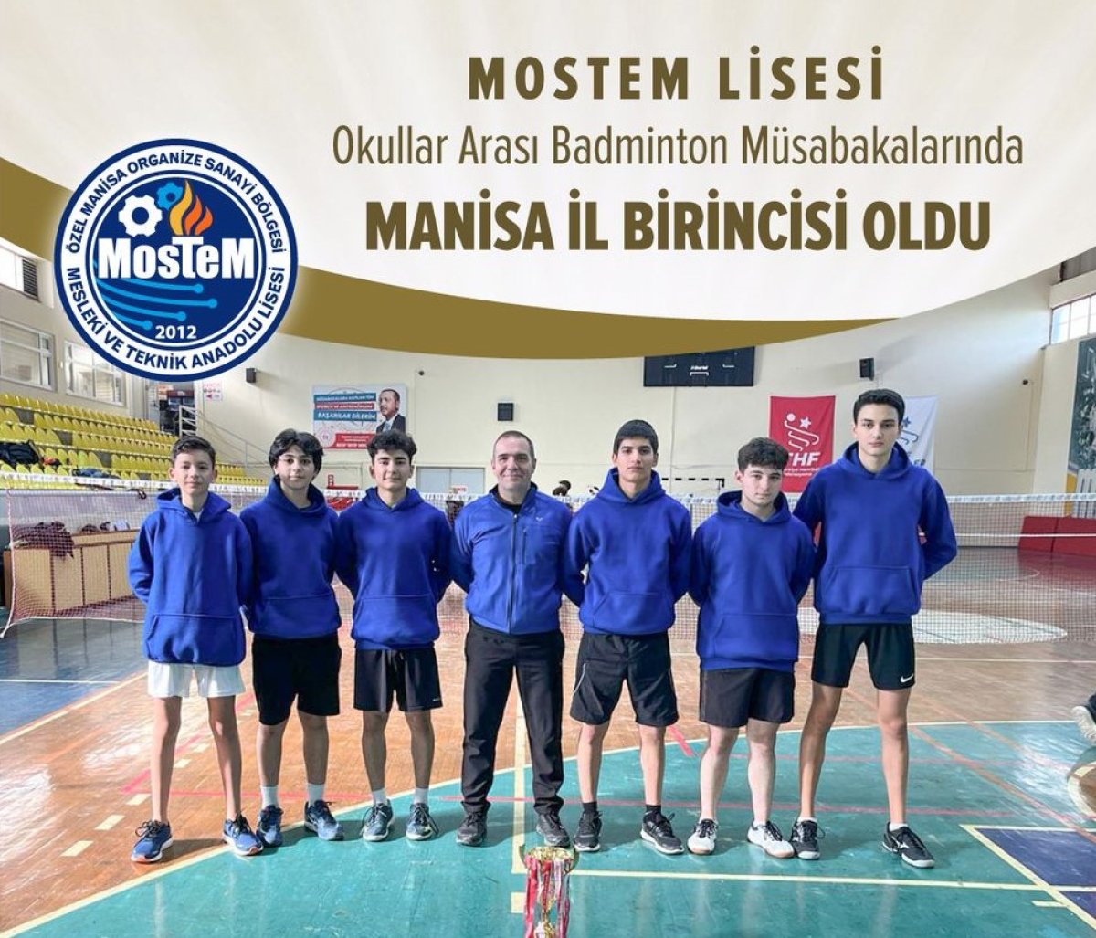 MOSTEM Lisesi Okullar Arası Badminton Müsabakalarında Manisa il birincisi oldu.Manisa'da düzenlenen okullar arası badminton müsabakalarında tüm rakiplerini yenerek 1. olan MOSTEM Lisesi, Afyon'da düzenlenecek olan grup müsabakalarında ilimizi gururla temsil edecek.Sporcularımızı tebrik ediyor, başarılarının devamını diliyoruz.