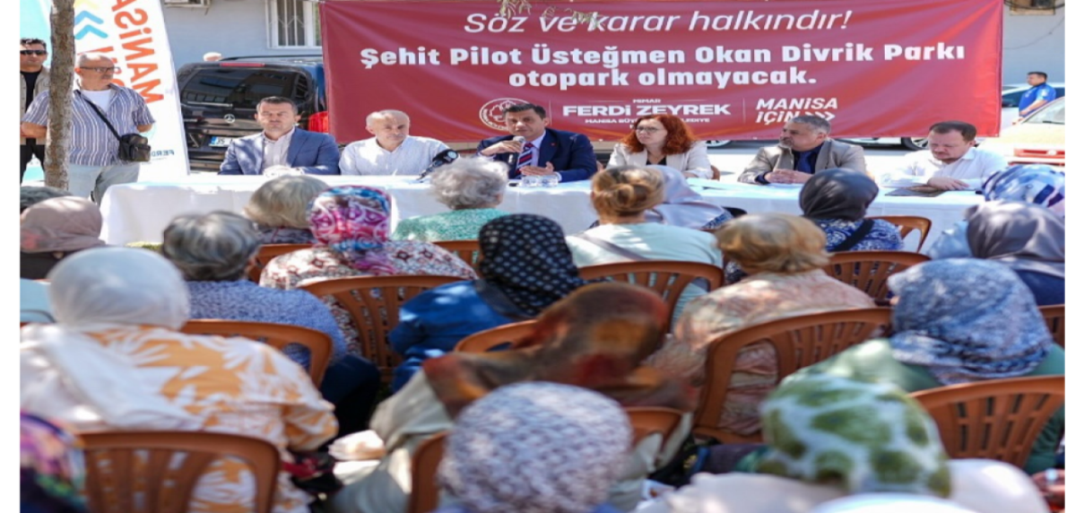 Manisa büyükşehir belediye başkanı Ferdi Zeyrek Okan Divrik Parkı’nda vatandaşlar ve muhtarlarla otopark sorununu çözmek için bir araya geldi.Parkın geleceğiyle ilgili düzenlediğimiz anket sonucunda mahalle sakinlerimiz otopark yapılmasını istemedi.ğini açıklayan başkan Zeyrek ''Biz de bu karara saygı duyduk. Okan Divrik Parkı olduğu gibi kalacak.Katılımcı yönetim anlayışımızla her mahallede, her kararda vatandaşlarımızın sesine kulak vermeye devam edeceğiz. Görüşleriyle sürece katkı sunan tüm hemşehrilerimize teşekkür ederim.''dedi