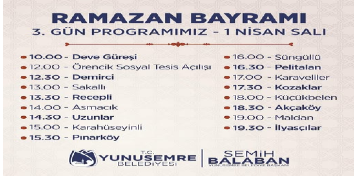 Ramazan Bayramı'nın 3. günü, Yenimahalle’de deve güreşi etkinliği ve Örencik Sosyal Tesisi açılışının ardından hemşehrilerimizle bir araya gelerek bayram coşkusunu hep birlikte paylaşacağız.