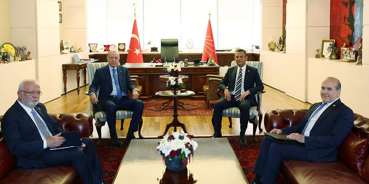 Cumhurbaşkanı Erdoğan, 18 yıl sonra CHP Genel Merkezi'ne geldi. Erdoğan, CHP lideri Özel ile görüşecek. Ziyaret kapsamında Cumhurbaşkanlığı forsu olan bayrak CHP Genel Merkezi önünde göndere çekildi.Cumhurbaşkanı Recep Tayyip Erdoğan, CHP Genel Merkezi'nde CHP Genel Başkanı Özgür Özel'e iade-i ziyarette bulunuyor.Erdoğan'ı, parti binası önünde Özel karşıladı. Erdoğan ve Özel, Genel Merkez önünde tokalaşarak, basın mensuplarına poz verdiler.Erdoğan, Özel ile Genel Merkezdeki başkanlık makamında görüşecek.Bu ziyaret, Cumhurbaşkanı Erdoğan’ın 18 yıl aradan sonra CHP Genel Merkezi'ne yaptığı ilk ziyaret oldu. Erdoğan en son, 2006 yılında CHP’nin yeni genel merkezine taşınması dolayısıyla dönemin Genel Başkanı Deniz Baykal’a “Hayırlı olsun” ziyaretinde bulunmuştu.