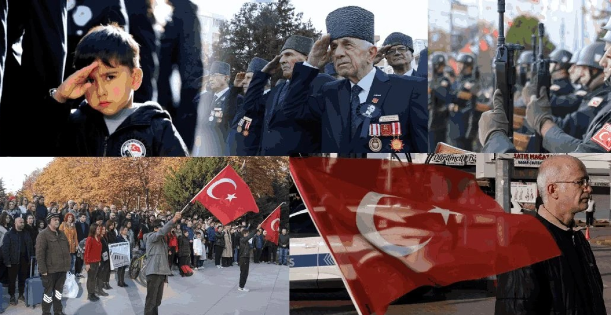 Türkiye Cumhuriyeti’nin kurucusu Mustafa Kemal Atatürk, 10 Kasım’da bir kez daha saygıyla anıldı. Saat 9’u 5 geçe siren sesleri duyulunca tüm Türkiye, Atatürk için 2 dakika saygı duruşunda durdu.Türkiye Cumhuriyeti’nin kurucusu Ulu Önder Mustafa Kemal Atatürk, 86. ölüm yıl dönümünde bütün yurt genelinde saat 9’u 5 geçe 2 dakikalık saygı duruşu ile bir kez daha anıldı.Gencinden yaşlısına, tüm Türkiye Atatürk için ayağa kalktı. Saygı duruşuna geçerek fikren Atatürk'ün izinde olduğunu bir kez daha gözler önüne serdi.10 Kasım’da saat 9’u 5 geçe çalan siren seslerinin hemen ardından tüm Türkiye, saygı duruşunda bulunup hemen ardından da İstiklal Marşı okudu.Okullarda ara tatile çıkmadan hemen önce düzenlenen bayrak törenlerinde bayrak yarıya indi. Yarıya indiren öğrenci ile gönderin sağında ve solunda bayrağa dönük olarak duran iki diğer öğrencinin, "hazır ol" da bayrağı selamlaması ile 9'u 5 geçe Atatürk anıldı.
