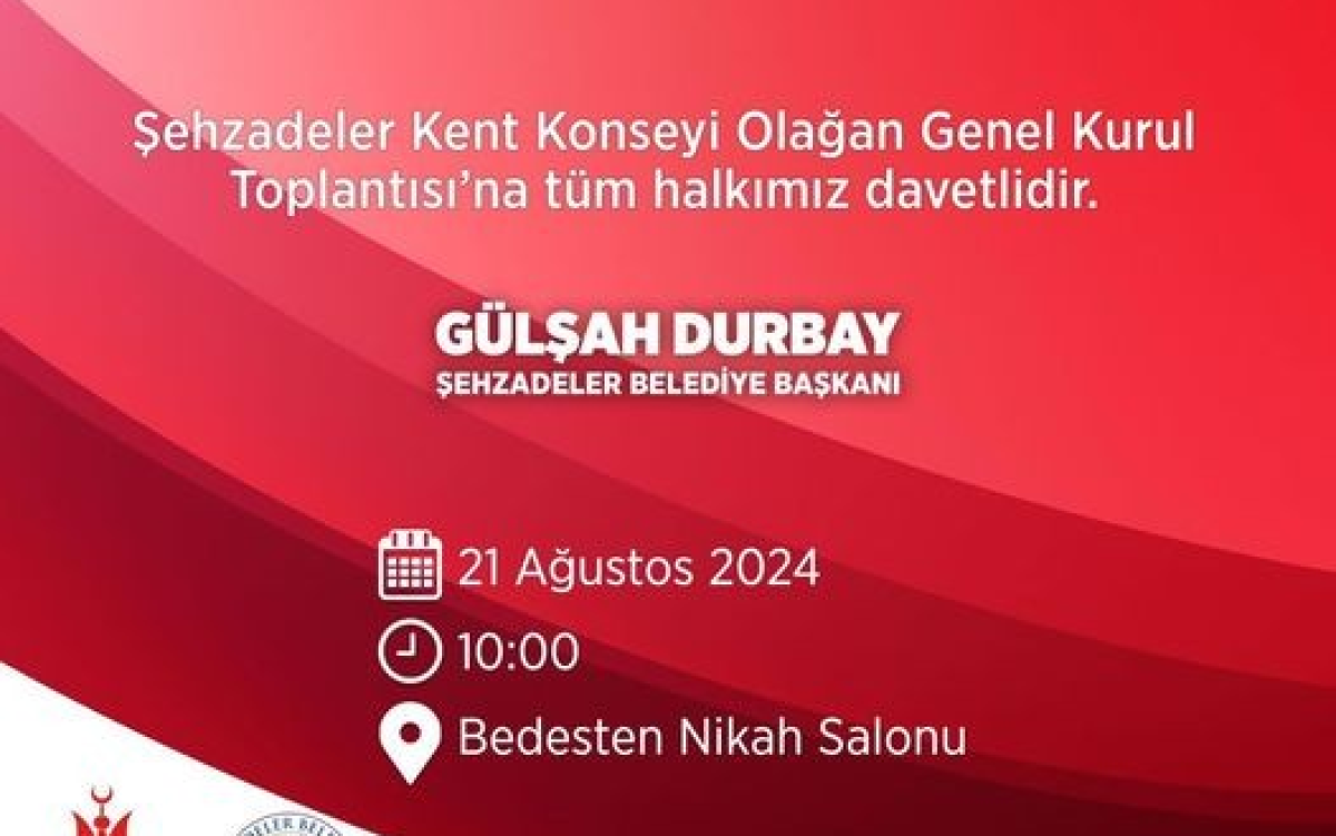 Şehzadeler Kent Konseyi Olağan Genel Kurul Toplantısı 21 Ağustos 2024 Çarşamba günü saat: 10:00’da Bedesten Nikah Salonu’muzda gerçekleştirilecektir.Olağan genel kurulumuza tüm halkımız davetlidir.