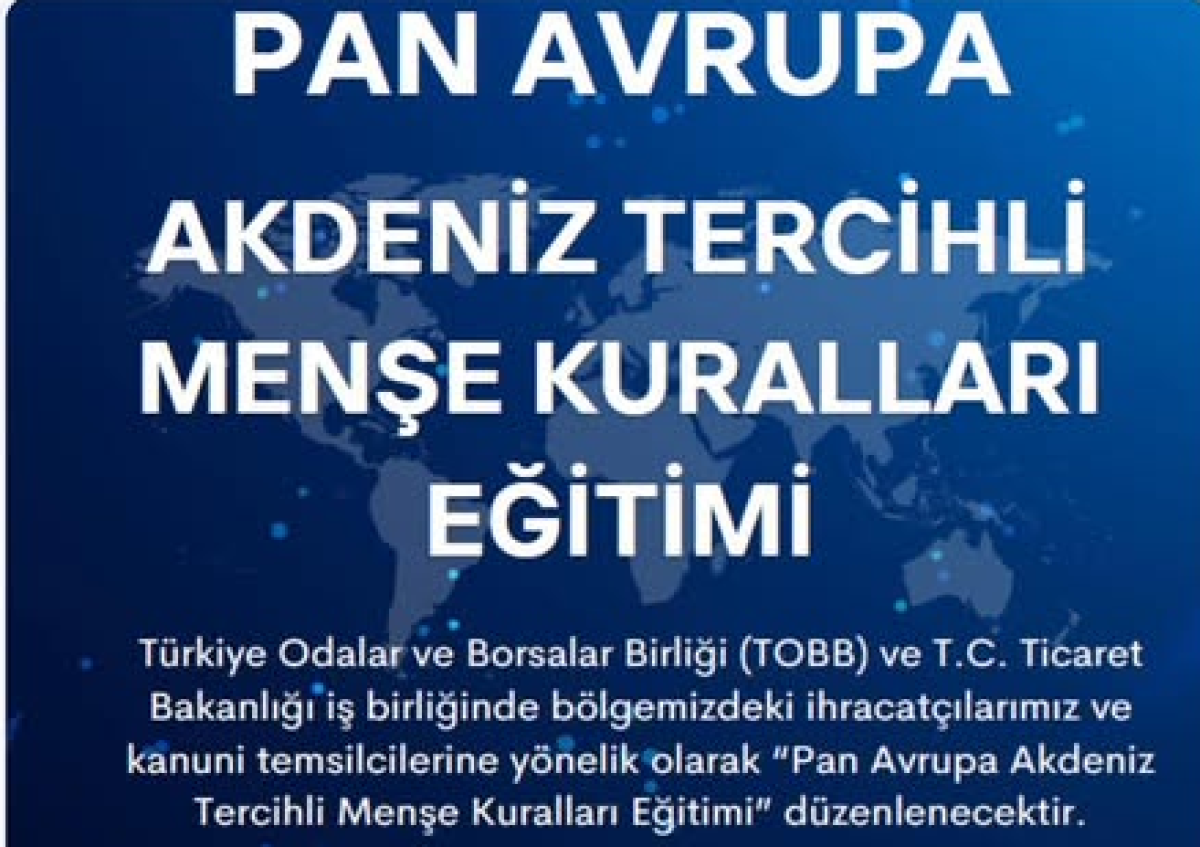 Türkiye Odalar ve Borsalar Birliği (TOBB) ve T.C. Ticaret Bakanlığı iş birliğinde, bölgemizdeki ihracatçılarımız ve kanuni temsilcilerine yönelik olarak 13 Mart 2026 Cuma günü 10:00 - 17.00 saatleri arasında Odamız Hizmet binasında "Pan Avrupa Akdeniz Tercihli Menşe Kuralları Eğitimi" düzenlenecektir.Bu kapsamda düzenlenecek eğitimde;