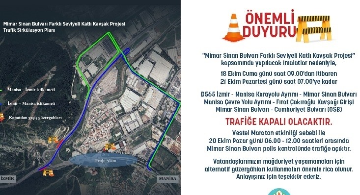 Manisa Büyükşehir Belediyesinden yapılan açıklamada, Mimar Sinan Bulvarı Farklı Seviyeli Katlı Kavşak Projesi kapsamında önemli bir ulaşım düzenlemesi yapılacağı duyuruldu. Çalışma kapsamında 18 Ekim Cuma günü saat 09.00’dan 21 Ekim Pazartesi günü saat 07.00’ye kadar D565 İzmir-Manisa Karayolu Ayrımı, Manisa Çevre Yolu Ayrımı ve Mimar Sinan Bulvarı üzerindeki bazı noktaların trafiğe kapatılacağı belirtildi. 20 Ekim Pazar günü düzenlenecek olan Vestel Manisa Yarı Maratonu nedeniyle Mimar Sinan Bulvarı’nın, 06.00-12.00 saatleri arasında polis kontrolünde trafiğe açık olacağı da bildirildi.