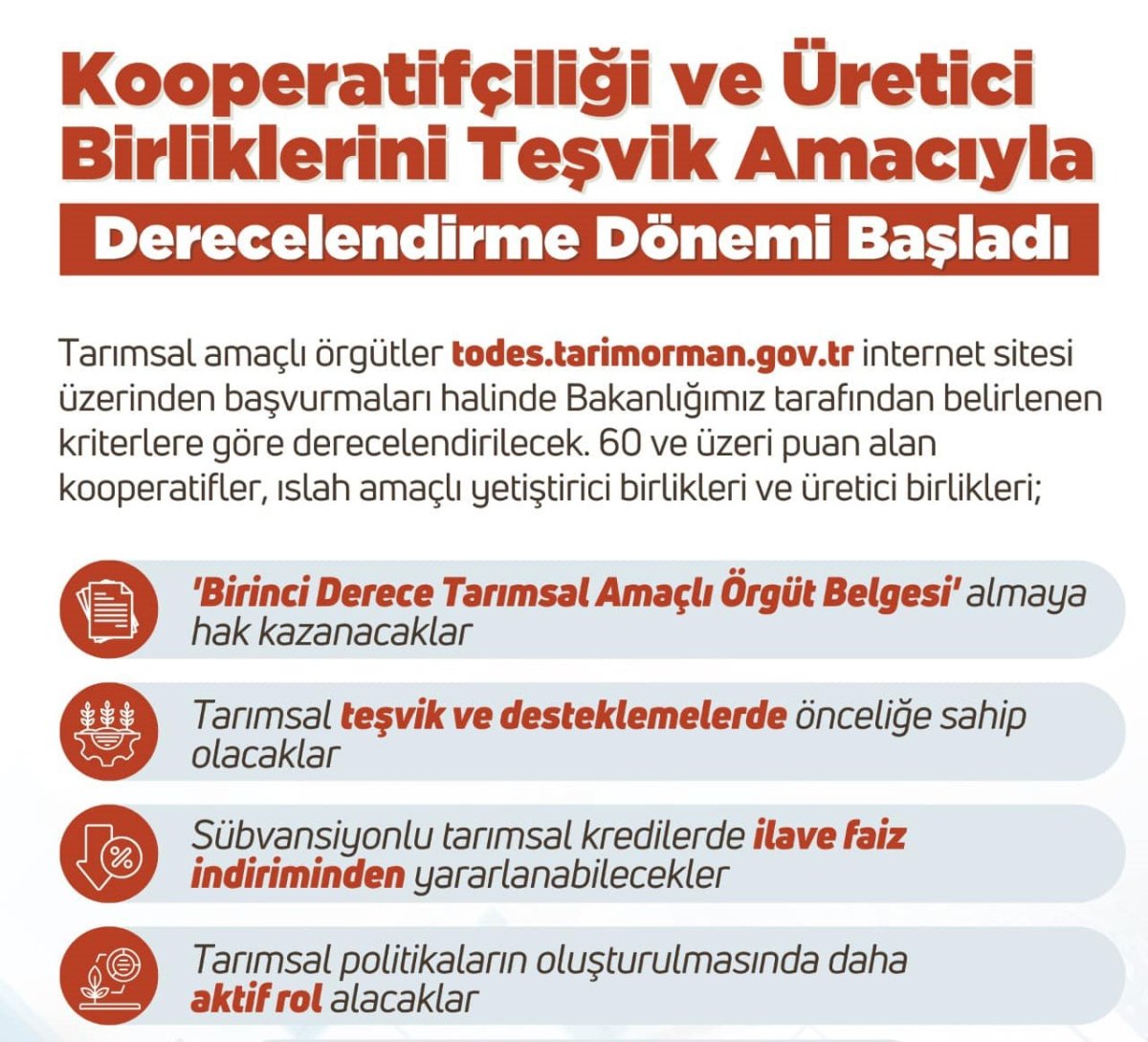 Tarımsal amaçlı örgütler "todes.tarimorman.gov.tr" internet sitesi üzerinden başvurmaları halinde Tarım ve Orman Bakanlığı tarafından belirlenen kriterlere göre derecelendirilecek.Bakanlığın resmi internet sitesinde yapılan açıklamaya göre, 60 ve üzeri puan alan kooperatifler, ıslah amaçlı yetiştirici ve üretici birlikleri "Birinci Derece Tarımsal Amaçlı Örgüt Belgesi" almaya hak kazanacak.Ayrıca birlikler tarımsal teşvik ve desteklemelerde önceliğe sahip olacak, sübvansiyonlu tarımsal kredilerde ilave faiz indiriminden yararlanabilecek ve tarımsal politikaların oluşturulmasında daha aktif rol alacak.Başvurular, 31 Mart'a kadar yapılabilecek.