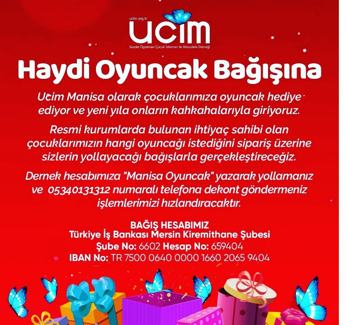 Hangi çocuğun hangi oyuncağı istediğini kamu kurumlarda bulunan çocuklarla tek-tek konuşarak saptadıklarını, oyuncak yardımında bulunacak hayırseverlerin, derneğe başvurmaları halinde bağışcılara liste verileceğini hatırlatan Yüksekdağ,,dernek hesabına 'Manisa Oyuncak' yazarak yolamalarını yada 05340131312 numaralı delefona dekont göndermeleri hişlemleri hızlandıracağını söyledi.Bağış hesbı:Türkiye İş Ban. Mersin Kiremithane ŞB. şube No:6602 hesapno:659404TR No:750006400000166020659404''