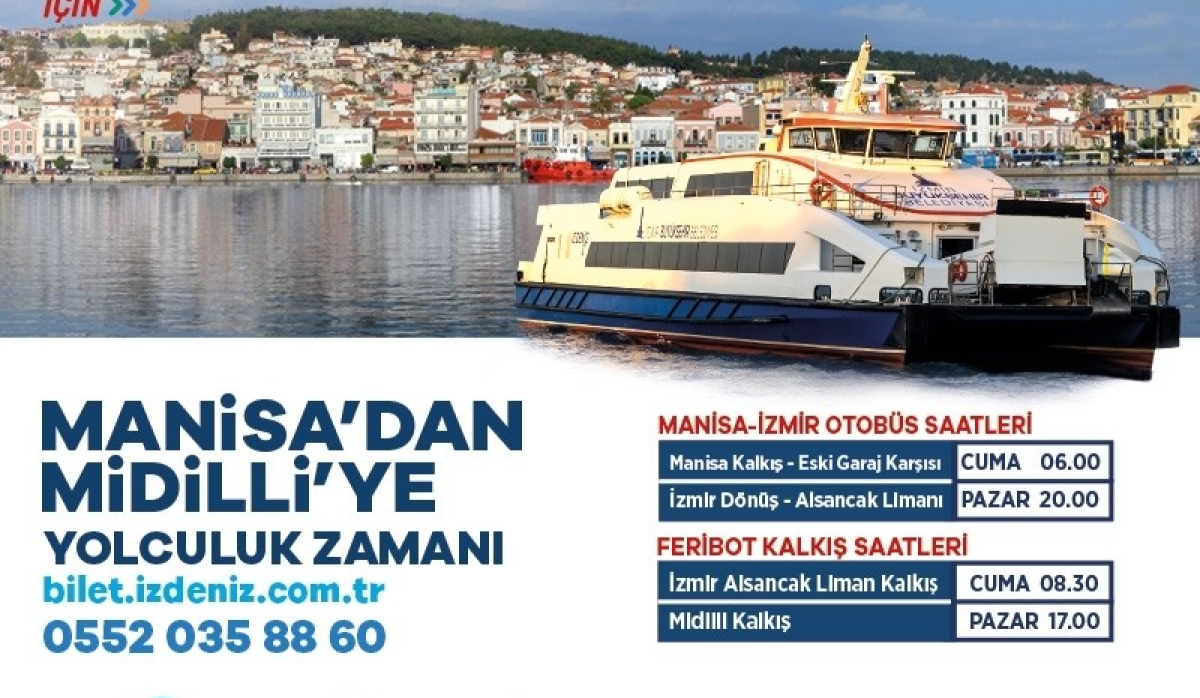 Manisa Büyükşehir Belediyesi’nin hayata geçirdiği “Manisa’dan Midilli’ye Yolculuk Zamanı” projesi kapsamında, Manisalılar için Midilli Adası’na ücretsiz ulaşım hizmeti başlatılacak. İzmir Büyükşehir Belediyesinin iştiraki İzmir Deniz İşletmeciliği Nakliye ve Turizm Ticaret A.Ş. (İZDENİZ) ile yapılan işbirliği sayesinde Manisalılar, her Cuma günü İzmir Alsancak Limanı’ndan kalkan feribotlarla Midilli’nin eşsiz güzelliklerini keşfetme fırsatı bulacak. Manisa’dan Alsancak Limanı’na, Eski Garaj karşısındaki benzin istasyonu önünden sabah 06.00’da Manisa Büyükşehir Belediyesinin ücretsiz servisi hareket edecek. Pazar günü, saat 20.00’de ise Midilli Adası’ndan dönen Manisalılar, yine Alsancak Limanı’ndan Manisa’ya getirilecek.