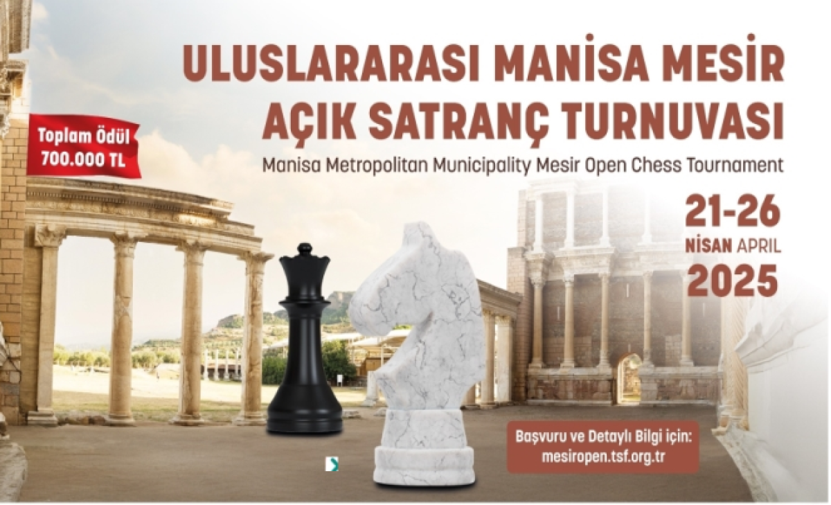 Manisa, dünyadan ve Türkiye’den önemli satranç sporcularını bir araya getirecek. 485’inci kez düzenlenecek Uluslararası Manisa Mesir Macunu Festivali kapsamında, Uluslararası Manisa Mesir Açık Satranç Turnuvası ile Mesir Hızlı Satranç Turnuvası düzenlenecek. Manisa Büyükşehir Belediyesi ile Türkiye Satranç Federasyonu iş birliğiyle ilk kez gerçekleştirilecek olan Turnuva, 21-26 Nisan 2025 tarihleri arasında Anemon Grand Manisa Otel’de düzenlenecek. Toplam ödülün 700 bin lira olarak belirlendiği uluslararası turnuvaya başvurular 17 Nisan 2025 Perşembe günü saat 17.00’ye kadar www.mesiropen.tsf.org.tr