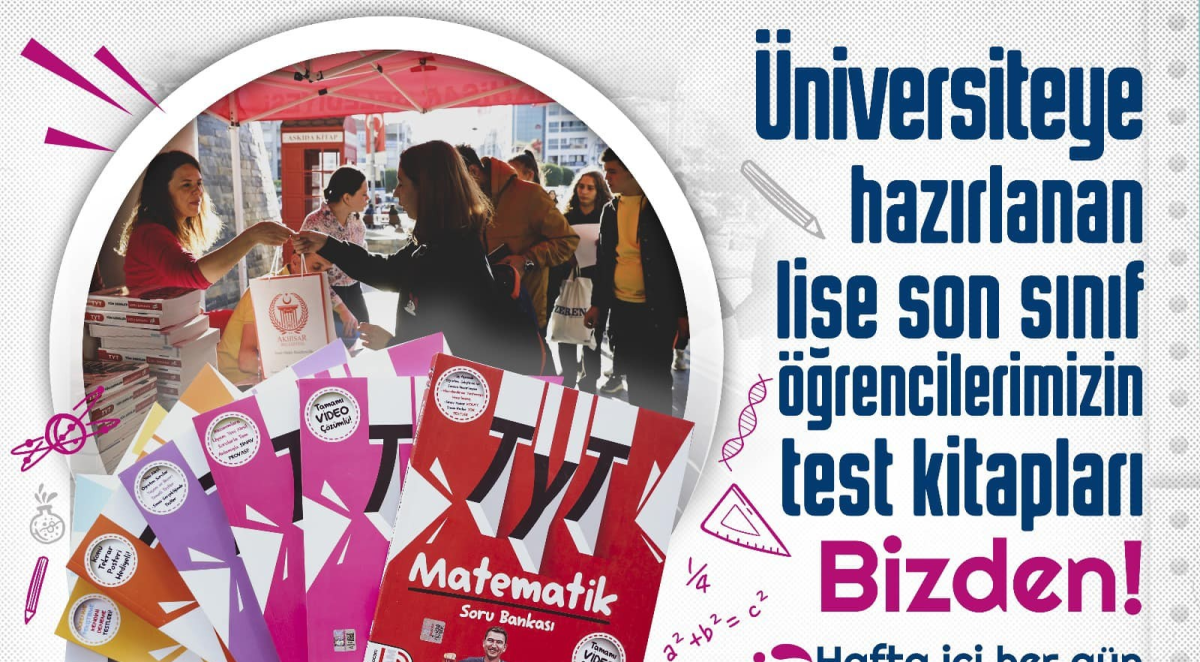 Akhisar belediyesi Üniversite sınavına hazırlanan 12. sınıf öğrencilere test kitabı yardımı.Belediye,Gençlerimizin eğitim yolculuğunda karşılaştıkları maddi zorlukları biliyoruz. Bu yüzden, Akhisar Belediyesi olarak uzman eğitimciler tarafından hazırlanan test kitaplarını ücretsiz olarak gençlerimize ulaştırıyoruz.Hafta içi her gün, belediyemizin önüne kuracağımız stanttan kitaplarınızı alabilirsiniz. Velilerimiz de öğrencileri adına başvuruda bulunabilir.