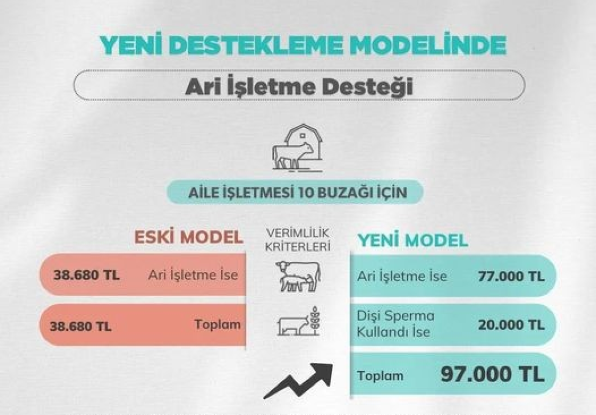 "Üretimin Bereketi Yeni Destekleme Modeli"Yeni modelde belirlenen verimlilik kriterleri gerçekleştirildiğinde Ari İşletme Desteğinde yüzde 151Arılı Kovan Desteğinde yüzde 217, Büyükbaş Hayvan Desteğinde yüzde 175 artış sağlanacaktır.