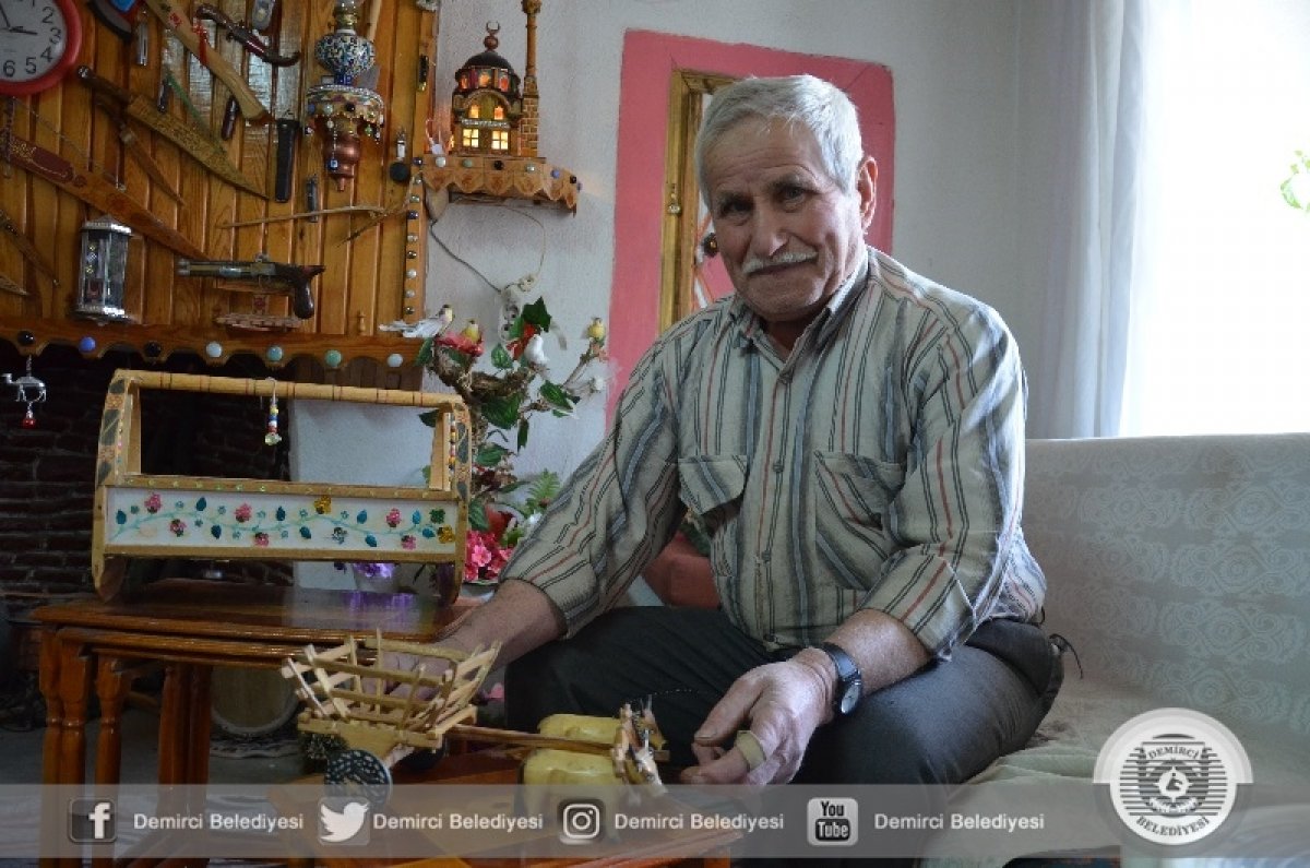 Demirci'de yaşayan 78 yaşında Ayhan Yılmaz, hobi olarak atölyesinde ahşaptan ürettiği el işi mutfak eşyaları, beşik, baston ve oyuncakları çocukları sevidiriyor.Uzun yıllar Demirci'de halı fabrikalarında işçi olarak çalıştıktan sonra emekli olup ilçeye 20 kilometre uzaklıktaki  Esenyurt Mahallesi'ne yerleşen 2 çocuk babası Ayhan Yılmaz, evinin alt katında kurduğu küçük atölyede el aletleriyle ahşaptan baston, minyatür at arabaları, beşik, minyatür cami  üretiyor.Ahşap eşyalara çeşitli motifler de işleyerek bir sanat eseri oluşturan Ayhan Yılmaz, bunları, komşularına, ziyarete gittiği yerlerdeki çocuklara hediye ediyor.Yılmaz:"Yıllardır ahşaba merakım vardı. Eşimi kaybedince daha çok önem verdim. Koronavirüs nedeniyle bir yere gidilmediği için burası benim hazinem." dedi.